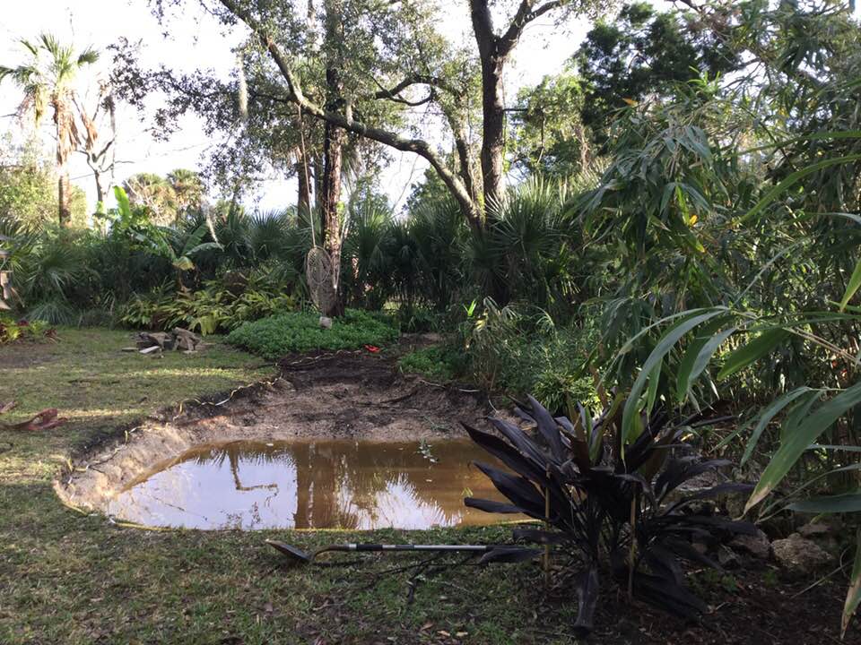 “Reflets Dans L’eau” The hole will slowly drain itself of this morning’s impressionistic reflections and soon I’ll be ordering the 300 lb. rubber liner, pump and skimmer. Meanwhile, we visited a fancy pond place in Jacksonville a few days ago where we saw many perfect Coi ponds with extensive rock formations like the one below. First of all, there are no real rocks in Florida and Adirondack formations would be prohibitively expensive and belong outside Hyatt Regencies. I have to admit however, I hadn’t thought this through. How the hell am gonna’ finish these edges to resemble the subtropical meandering, low-country Limpopo beset with fever trees I’d dreamed of before the hurricanes? I’d planned on using Coquina – a local cement-like substrate of tiny fused shells (used to construct the 450 year old Castillo,) but I’ve since learned Coquina disintegrates when submerged in fresh water. Imagine that.